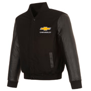 Show your Chevy pride with the Chevy Reversible Wool and Leather Jacket in black. Designed with a premium wool-blend body and genuine leather sleeves, this jacket offers a bold, varsity-inspired look. The reversible design features a sleek nylon lining, giving you two versatile styles in one. Embroidered appliqué Chevy patches are displayed on both sides, adding authentic detail that stands out.