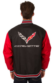 Show your Corvette pride with the Corvette Poly-Twill Jacket in black and red. Crafted from durable 100% poly-twill, this jacket combines classic style with everyday comfort. A quilted nylon lining provides warmth, while embroidered appliqué Corvette logos on the front and back deliver bold, authentic detail.