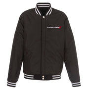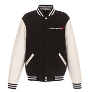 Show your Dodge pride with the Dodge Reversible Fleece Jacket with Faux Leather Sleeves in black and white. This versatile jacket features a warm fleece body and durable faux leather sleeves for a bold, varsity-inspired look. The reversible design includes a sleek nylon lining, giving you two styles in one. Embroidered Dodge logos are displayed on the front of both sides, adding authentic brand detail.