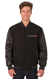 Show your Dodge pride with the Dodge Reversible Wool and Leather Jacket in black. Featuring a premium wool body and genuine leather sleeves, this jacket combines warmth, durability, and a bold varsity-inspired look. The reversible design includes a sleek nylon lining, giving you two styles in one versatile piece. Embroidered appliqué Dodge patches are displayed on both the front and back, ensuring authentic detail wherever you go.