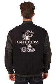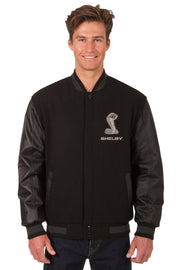 Show your passion for performance with the Shelby Cobra Reversible Wool and Leather Jacket in black. This premium jacket combines a wool body with genuine leather sleeves for a classic varsity-inspired look. The reversible design includes a sleek nylon lining, giving you two styles in one versatile piece. Embroidered appliqué Shelby Cobra patches are featured on both the front and back, ensuring bold, authentic detail.