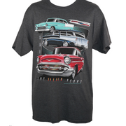 Refresh your wardrobe with our officially licensed 1955-1957 Chevy "The Golden Years" T-Shirt, crafted from premium dark gray 100% cotton. This stylish tee is essential for any classic car enthusiast. Celebrate the golden era of Chevrolet with this high-quality, comfortable shirt, perfect for any casual occasion.