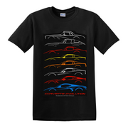 Chevrolet Corvette Evolution series C1-C8, printed on a black 100% cotton t-shirt. Officially licensed by General Motors.