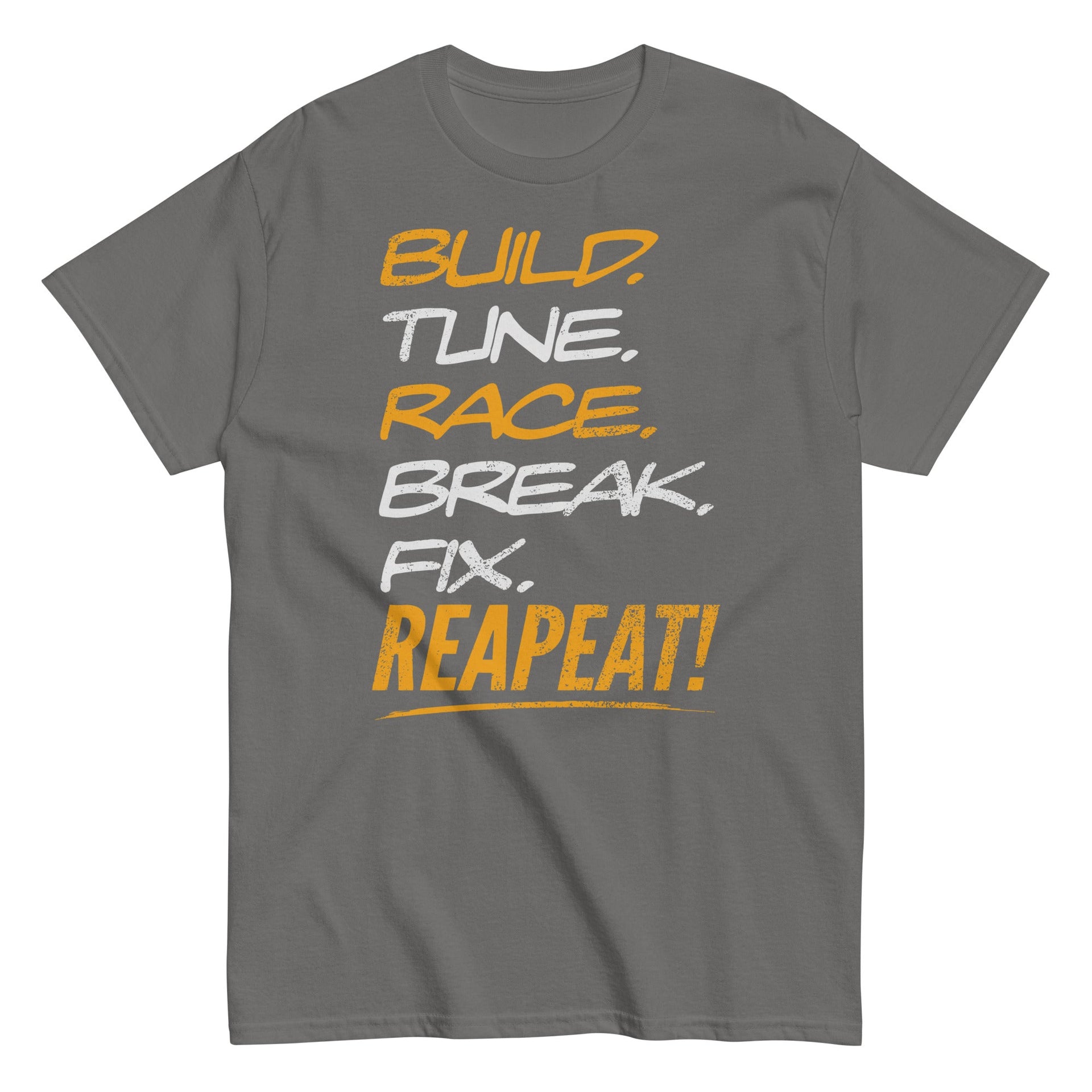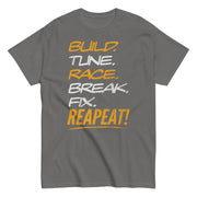 For the dedicated gearhead in your life, this Drag Racing T-Shirt epitomizes the relentless cycle of the racecar lover: 'Build, Tune, Race, Break, Fix, Repeat.' It's more than a mantra; it's a way of life for those who breathe hot rod culture, turbo diesel power, JDM finesse, and the adrenaline of drag racing.