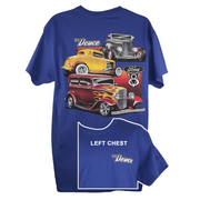 1932 is the year of The Deuce! Celebrate these iconic cars, including the coupe, sedan, and convertible, with our 100% cotton metro blue t-shirt. The design features "The Deuce" printed on the left chest and a detailed illustration on the back. This t-shirt is officially licensed by Ford Motor Company.
