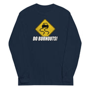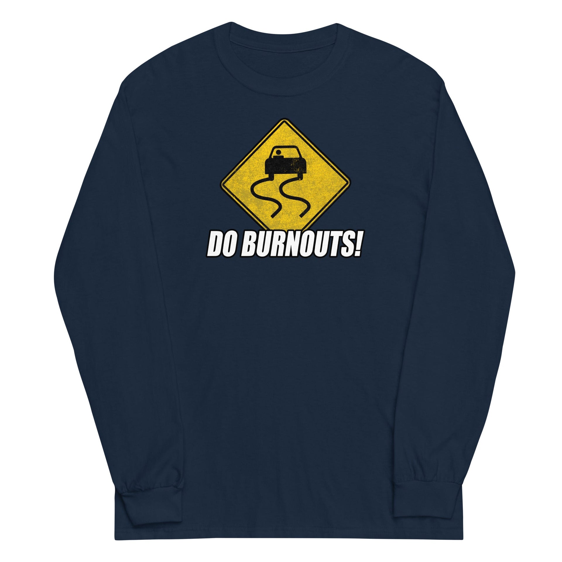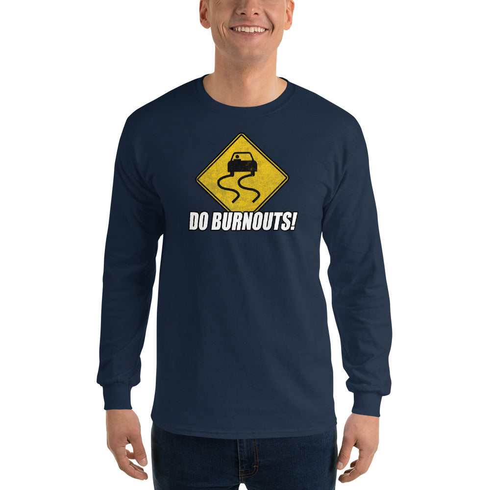Ignite a spark of humor and automotive passion with our Burnout Sign Funny Car Guy Long Sleeve Shirt. This unique piece captures the thrill of the ride and the cheeky spirit of car culture, making it a perfect choice for anyone who lives life a quarter mile at a time. Featuring the universally recognized wet slippery road sign with a twist, the command "DO BURNOUTS!" invites smiles and nods of agreement from fellow enthusiasts.