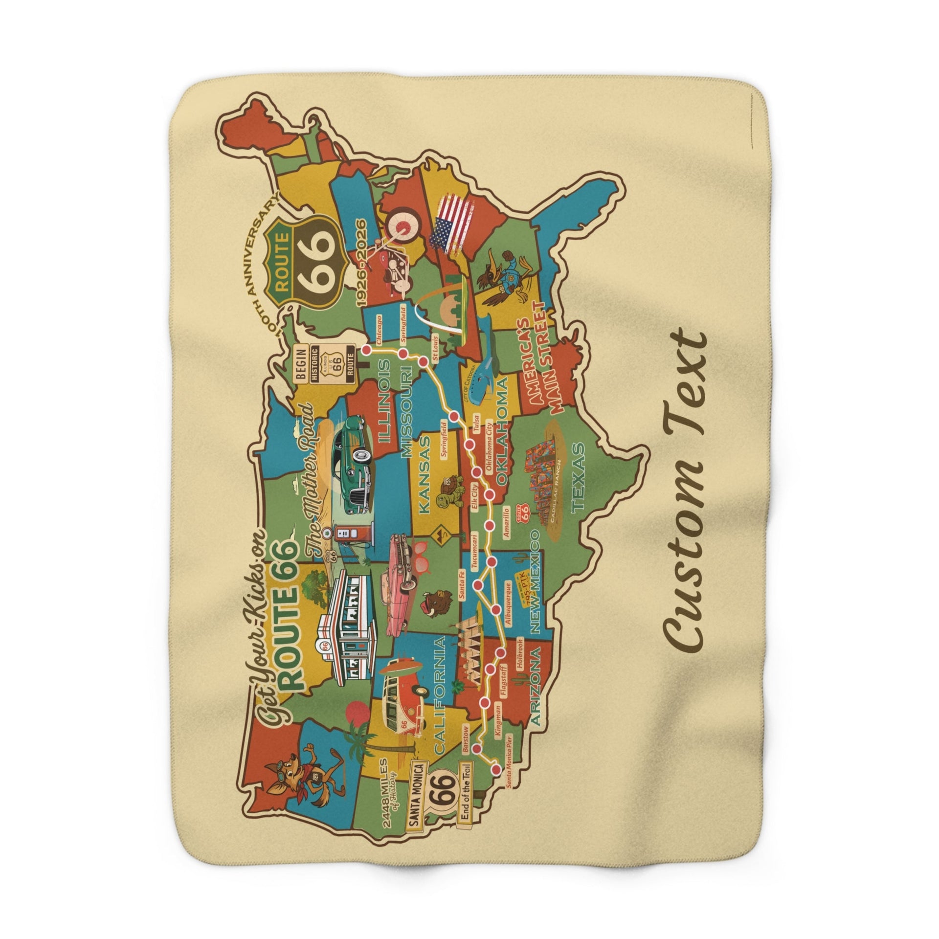 Celebrate the 100th Anniversary of Route 66 (1926–2026) with this ultra-soft sherpa blanket featuring a vibrant, vintage-style Route 66 map design! Perfect for road trip lovers, history buffs, and anyone who wants to bring a piece of the Mother Road into their home.