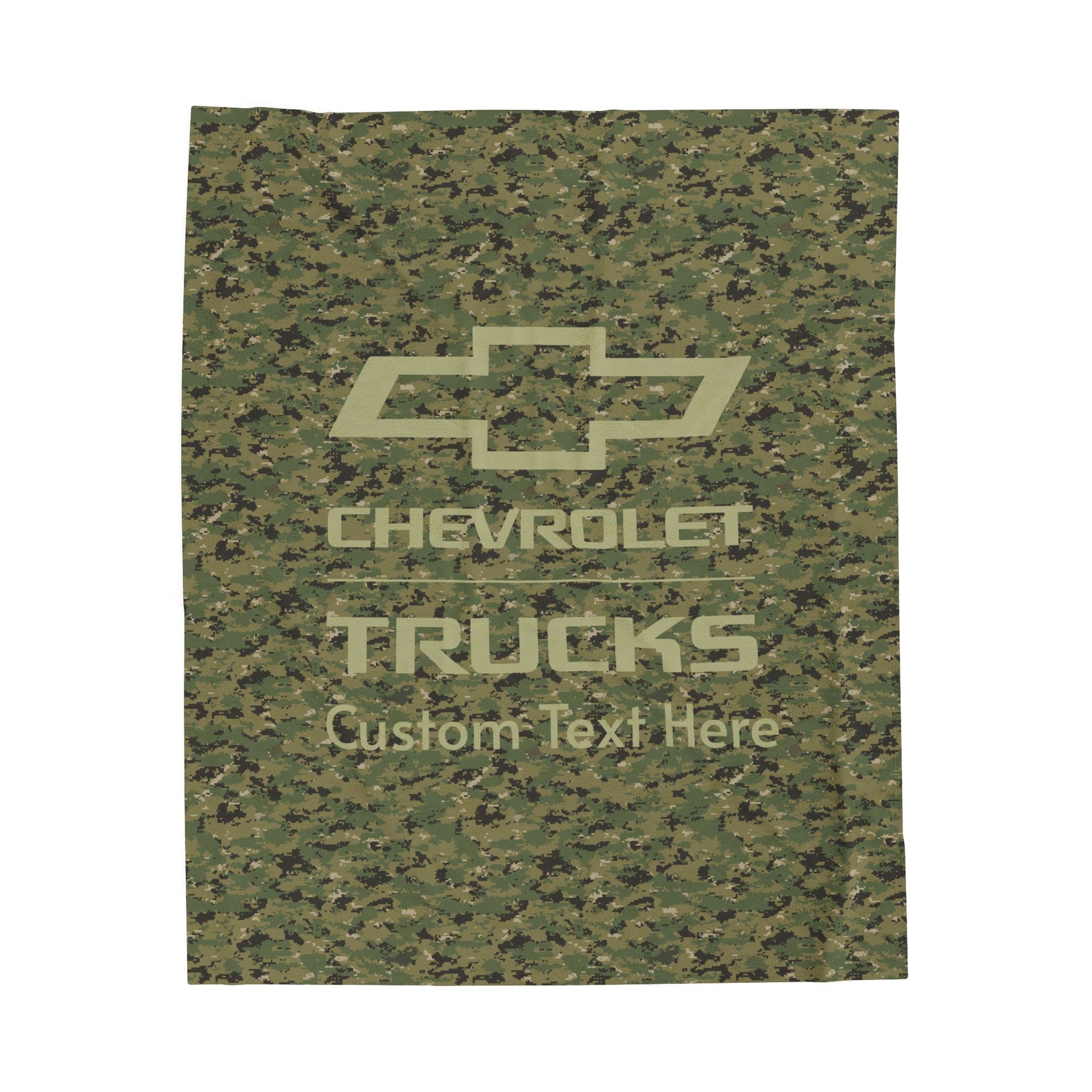 • Customizable Chevrolet Trucks Digital Camo Design with Bowtie Logo: Personalize this blanket with custom text alongside the Chevrolet Trucks Bowtie logo in a unique digital camo pattern, making it an ideal gift for Chevy truck lovers.