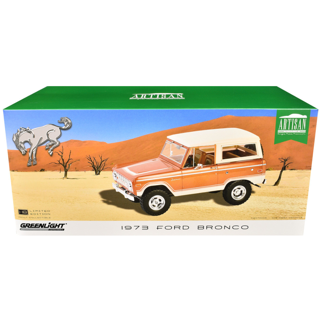 Brand new 1/18 scale diecast car model of 1973 Ford Bronco Hot Ginger Metallic with Cream Top "Artisan Collection" diecast model car by Greenlight.