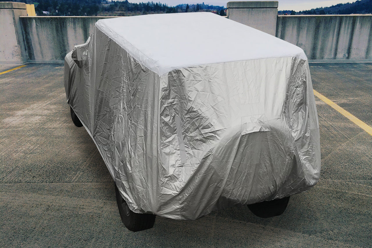 If you have a Jeep, then you know what it is like to get caught with the top down and doors off. Now you don't need to worry about that anymore! Just keep your tightly packed MCarCover in the back and you'll always be covered! We designed this to be like nothing available in the car market! Our top section is vinyl and fully waterproof, the sides are our super strong 150 threads per square inch material. 3 Wind Straps included, 2 Vents for breath... and wind ventilation.