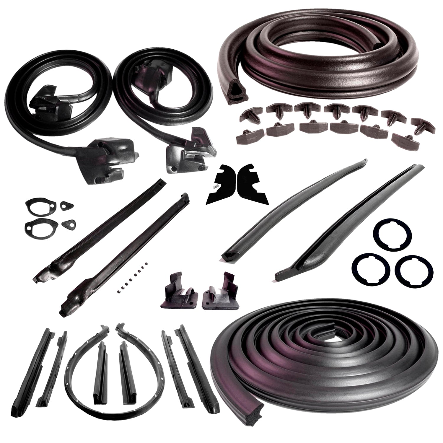 The RK 2003-125 by SUPERsoft is your ultimate solution for preserving your 1970 Chevrolet Chevelle Car's elegance and function. Known as the "Master Kit" or "Convertible Essentials," this comprehensive bundle includes everything from door seals (LM 12-A) to hood-to-cowl seal (CS 5), ensuring a seamless fit and perfect compatibility with your vehicle. Featuring robust protective design patterns, such as roof-rail and trunk seals, this kit prevents leaks and minimizes outside noise, offering enhanced peace and comfort. Easy installation makes it a hassle-free project for any car enthusiast. These components boast durability and a sleek finish, maintaining your car's vintage charm while offering superior functionality. Experience effortless restoration with door handle pads (MP 989-C ~ 4-pc set) and inner splash flaps that are crafted for precision. Crafted to give you the confidence of a safe and quiet ride, grab the RK 2003-125 kit today. Secure in the knowledge that you’re backed by a platinum warranty, guaranteed to keep your car's essence intact for a full 30 years. Choose quality, choose trust, and shield your ride effortlessly. Enjoy the unparalleled "No Hassle" guarantee for total peace of mind.