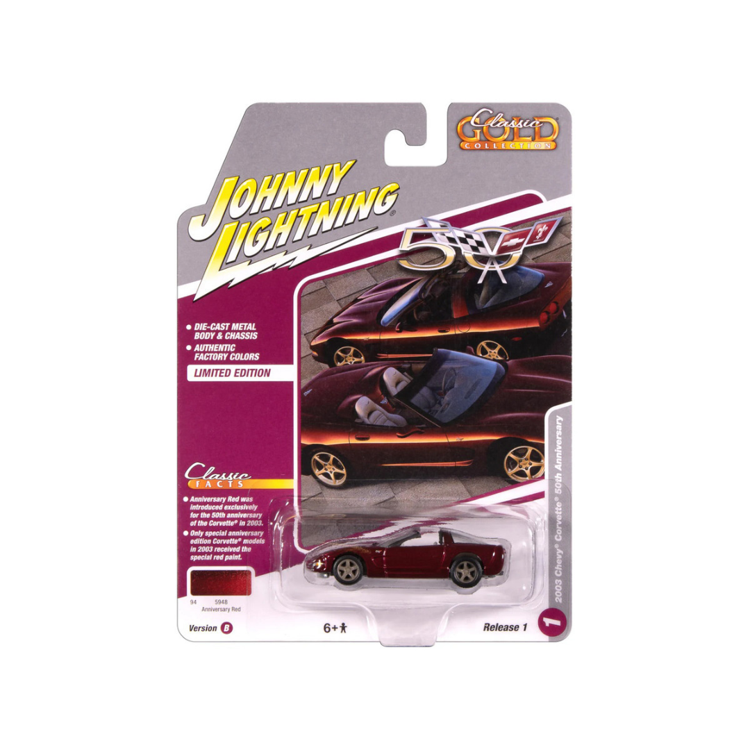 Brand new 1/64 scale diecast car model of 2003 Chevrolet Corvette Convertible "50th Anniversary" Anniversary Red Metallic "Classic Gold Collection" diecast model car by Johnny Lightning.