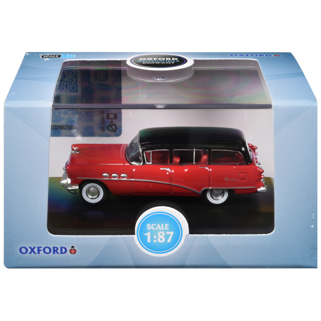 Brand new 1/87 (HO) scale diecast car model of 1954 Buick Century Estate Wagon Matador Red and Carlsbad Black with Red Interior diecast model car by Oxford Diecast.