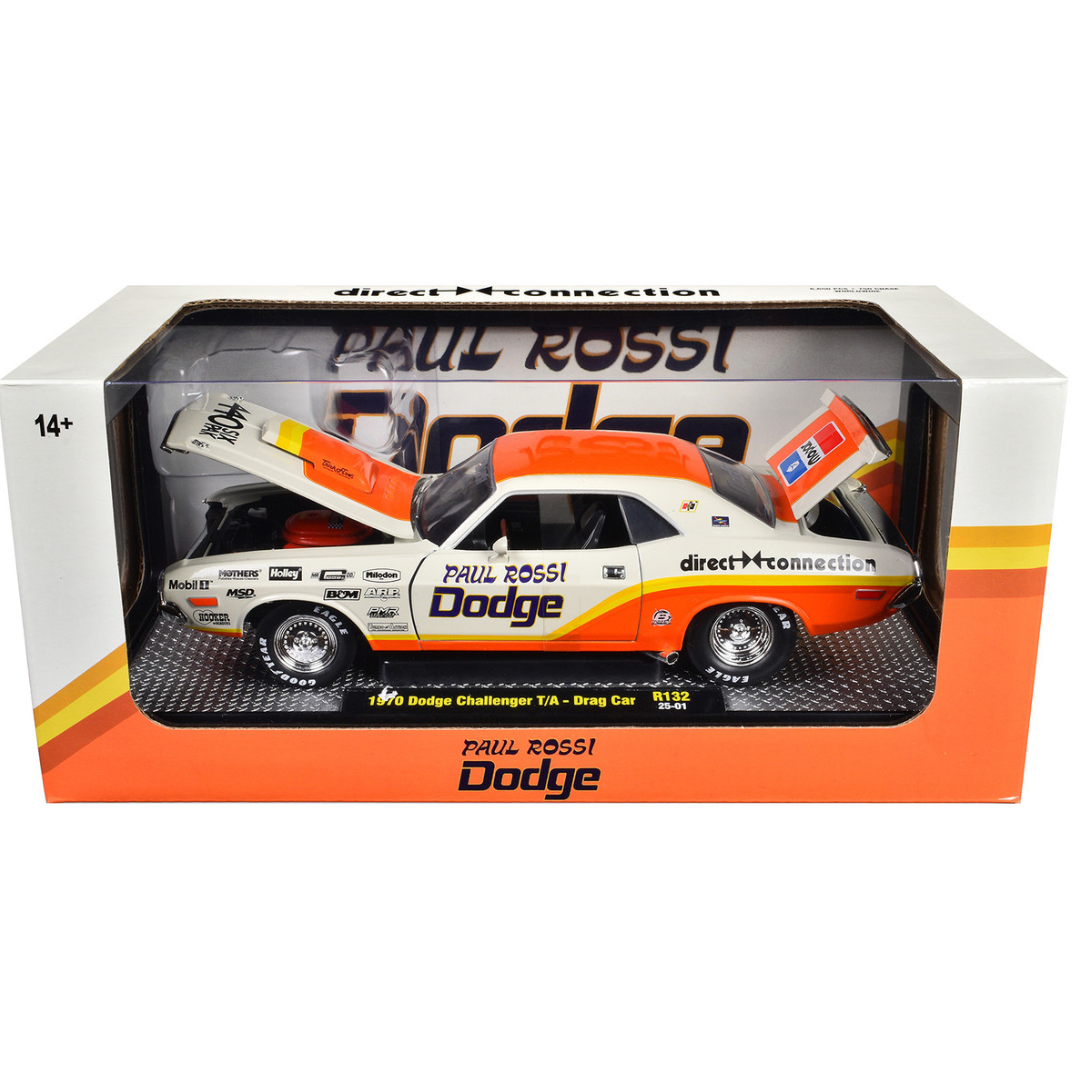 Brand new 1/24 scale diecast car model of 1970 Dodge Challenger T/A Drag Car "Paul Rossi" White and Orange with Graphics Limited Edition to 6650 pieces Worldwide die cast model car by M2 Machines.
