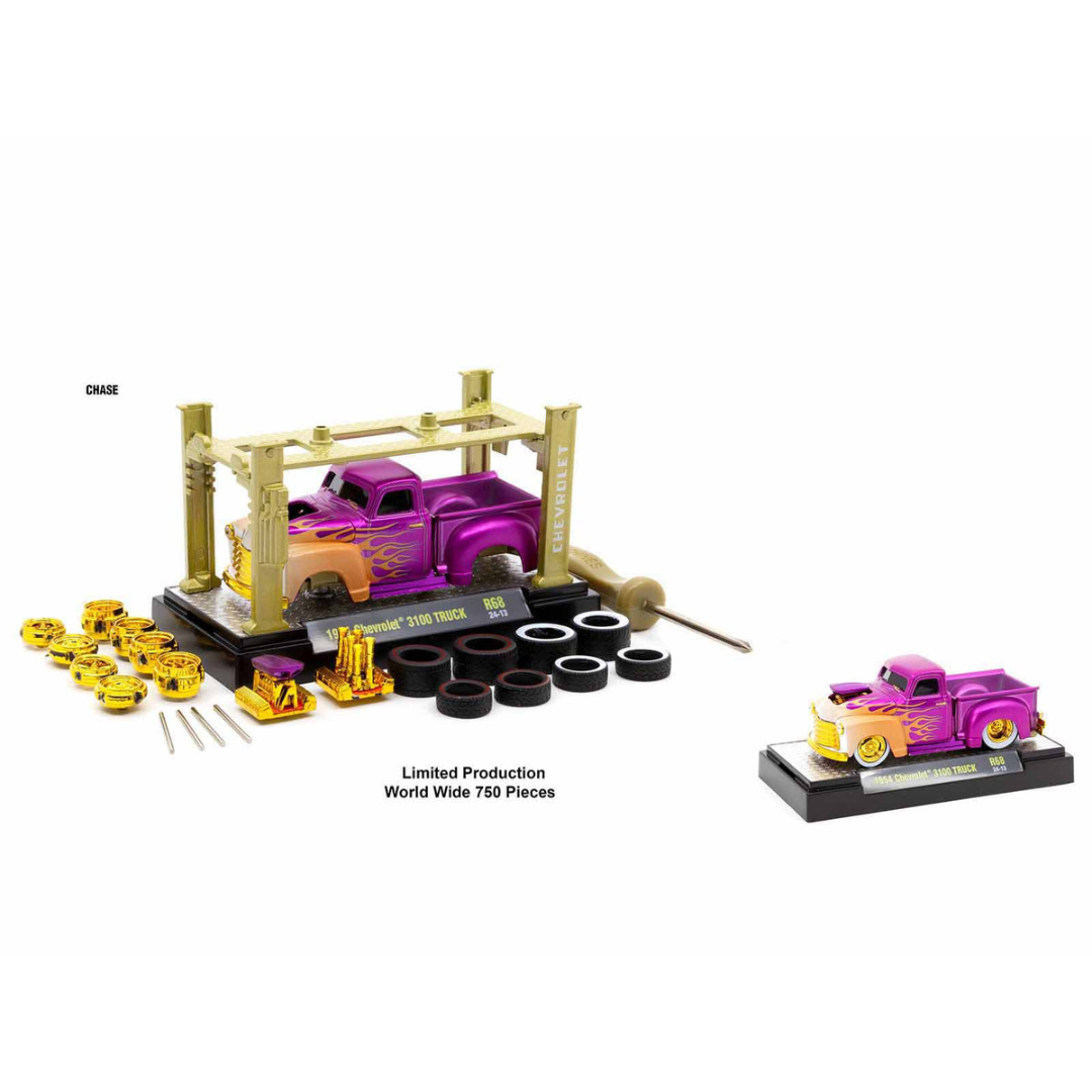 - CHASE MODEL KIT: 1954 Chevrolet 3100 Pickup Truck. The body is magenta metallic, the flames are orange and white, the wheels, bumpers and trim are gold chrome, the four-post lift is gold, the interior is gold.