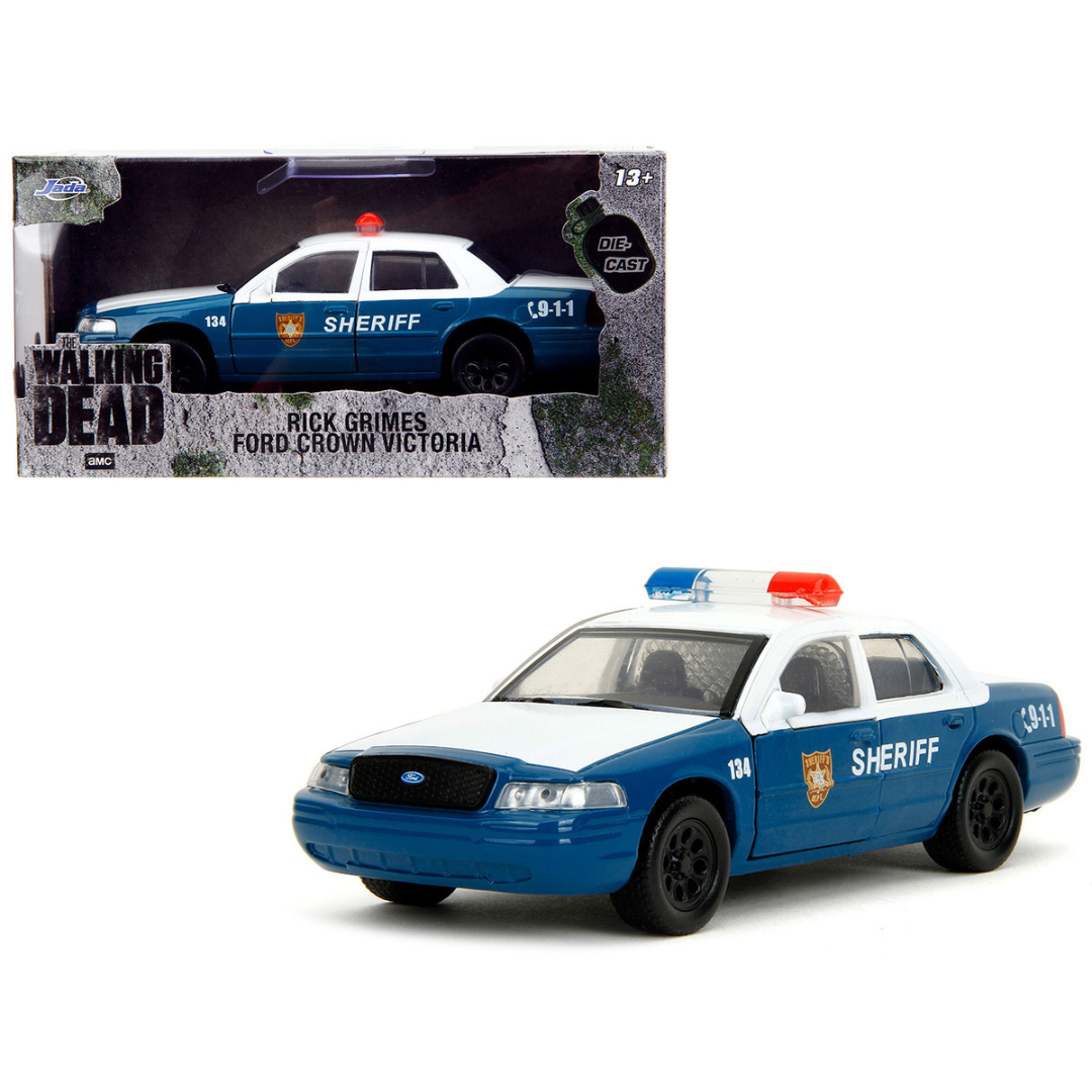 Brand new 1/32 scale diecast car model of Rick Grimes' Ford Crown Victoria "Sheriff" Blue and White "The Walking Dead" (2010-2022) TV Series "Hollywood Rides" Series diecast car model by Jada.
