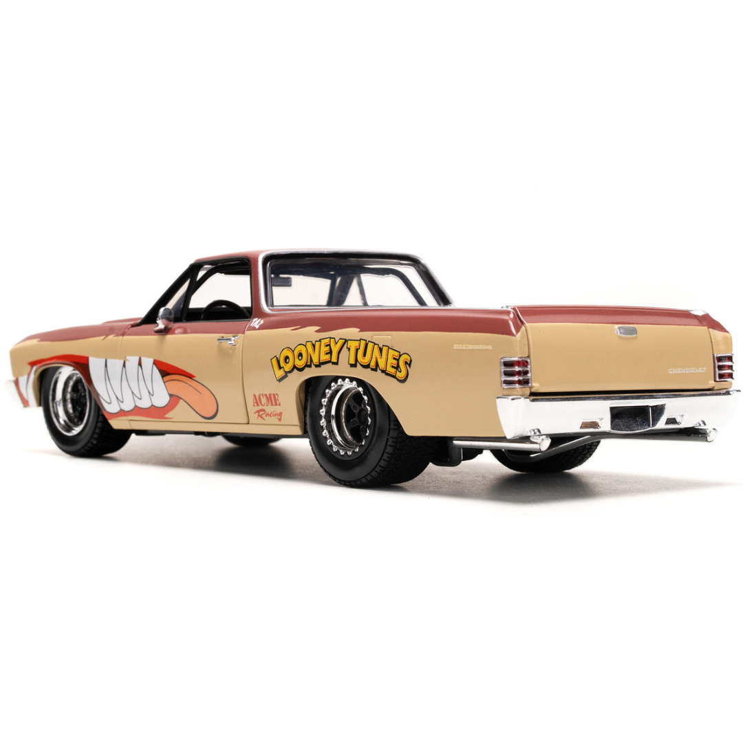 Brand new 1/24 scale diecast car model of 1967 Chevrolet El Camino Brown and Beige with Graphics and Tasmanian Devil (Taz) Diecast Figure "Looney Tunes" "Hollywood Rides" Series die cast model car by Jada.