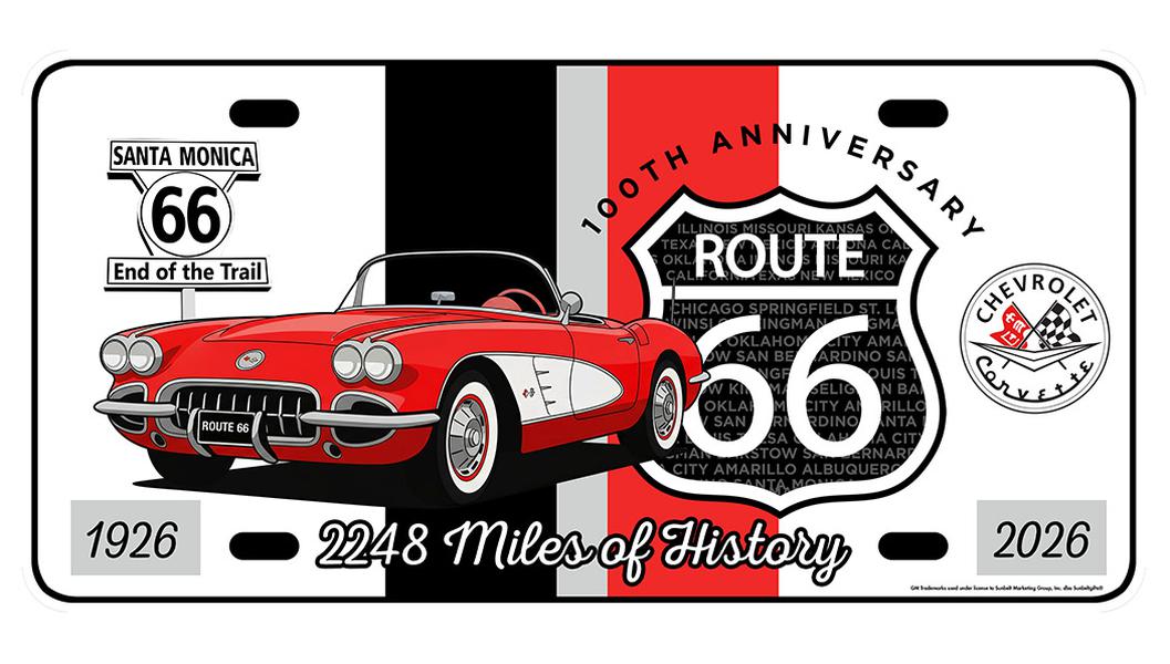 - Features a classic red and white C1 Corvette, paired with the Route 66 shield and “End of the Trail” sign.