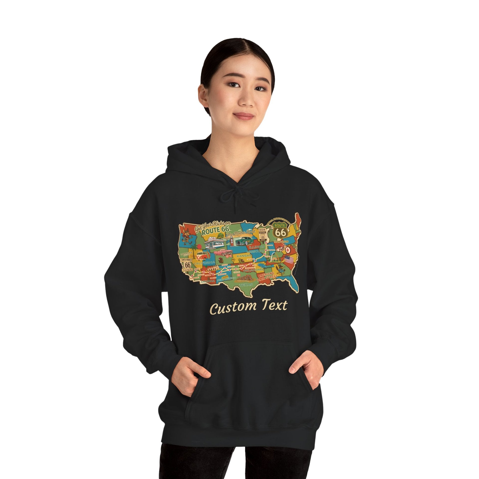 Celebrate the 100th anniversary of Route 66 (1926–2026) with a personalized Legends of Route 66 Hooded Sweatshirt! This cozy and stylish hoodie features a vibrant, illustrated map of the United States, highlighting the historic Route 66 from Chicago, Illinois to Santa Monica, California.