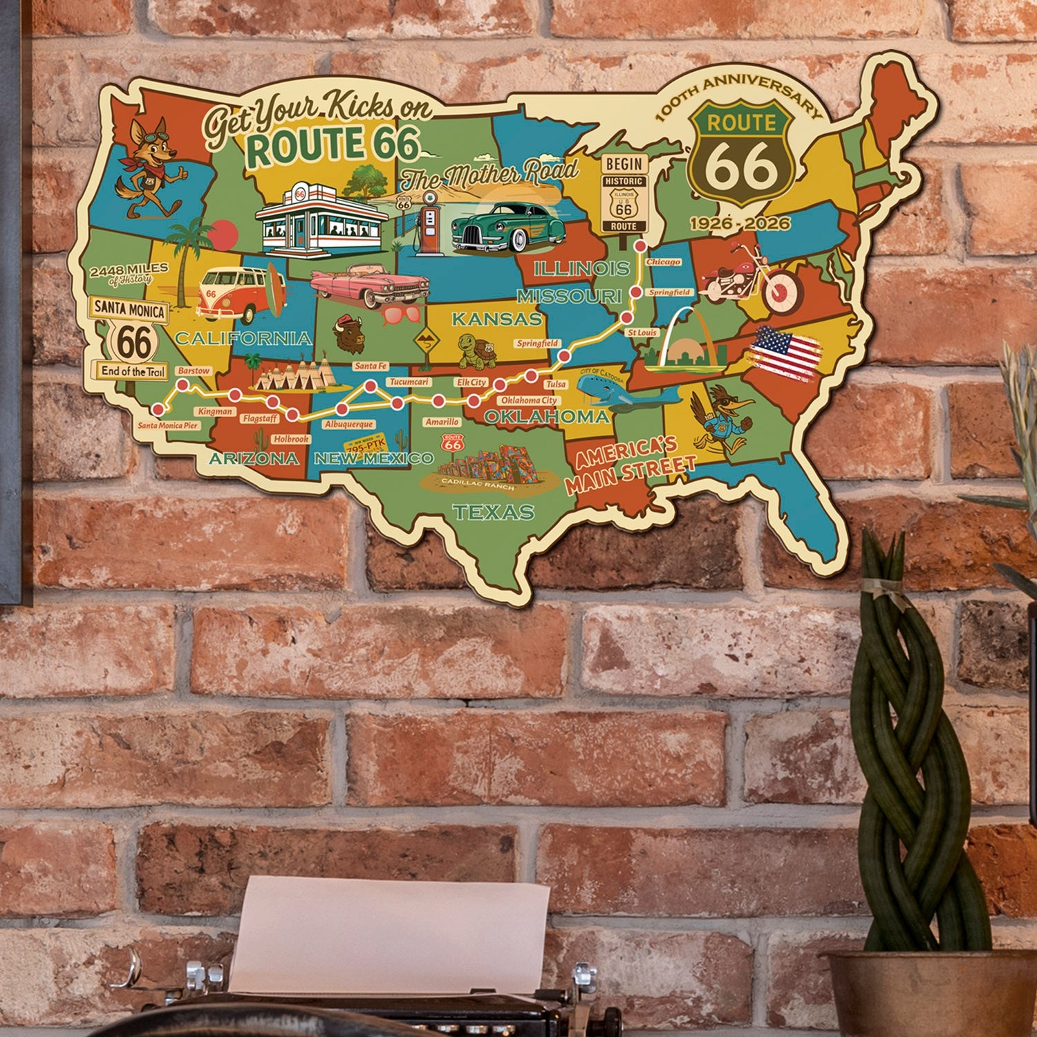 Legends of Route 66 USA Destination Map, 22 Gauge Metal Die Cut Wall Decor with Mascots