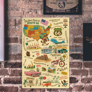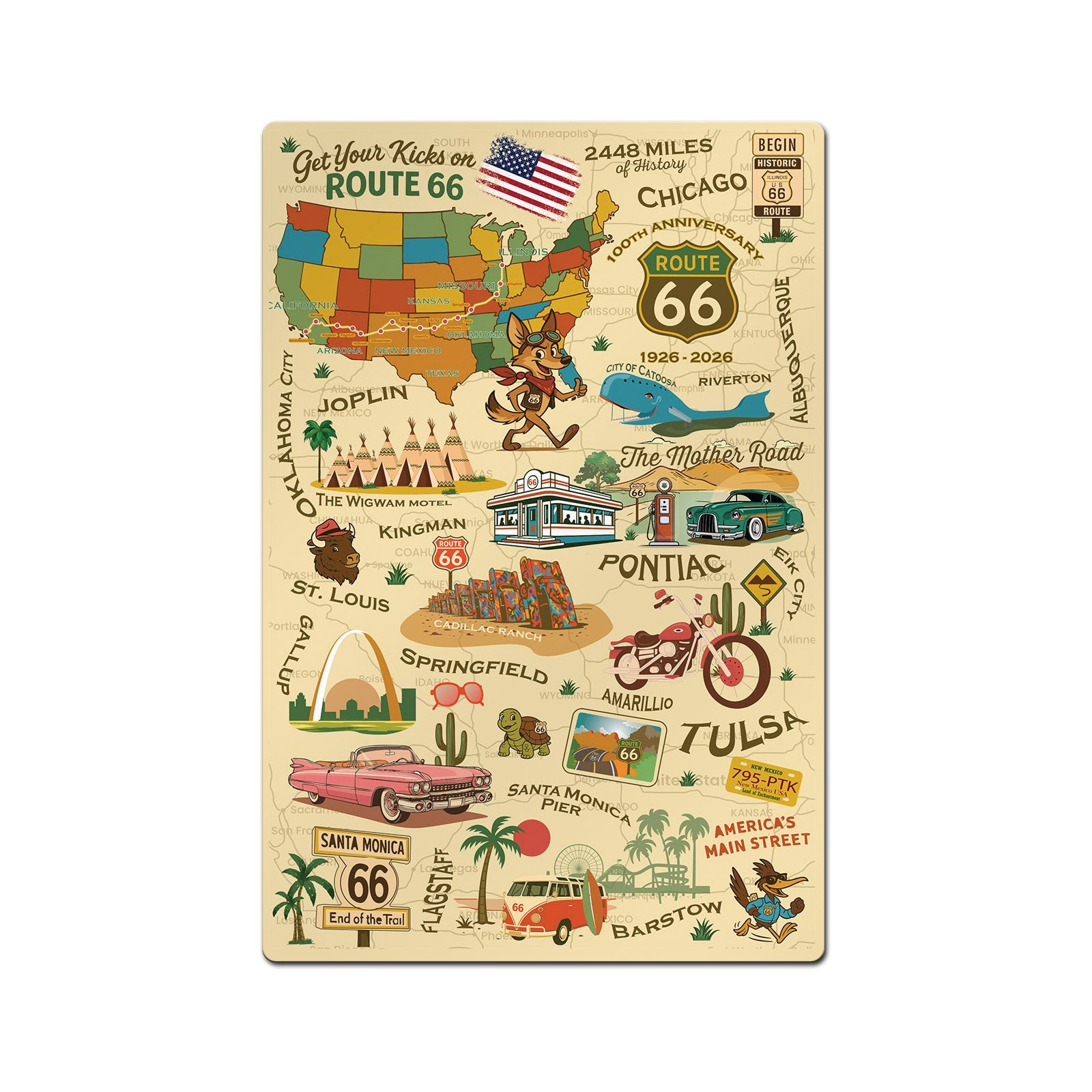 Discover the adventure of Route 66 with our exclusive 100th Anniversary Edition rectangular USA Made 22 Gauge Metal Wall Decor . This design highlights the historic journey from Chicago to Santa Monica, featuring classic Americana, famous destinations, and six unique mascots. Dusty the Coyote, Zoom the Road Runner, Shelby the Turtle, Big Mo the Buffalo, Hopper the Jack Rabbit and Rusty the Bald Eagle.