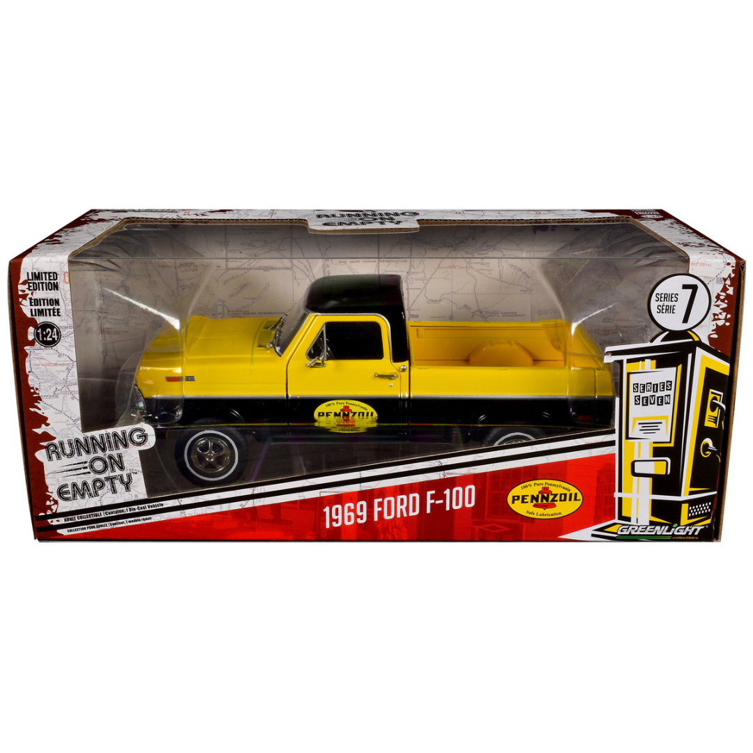 Brand new 1/24 scale diecast car model of 1969 Ford F-100 Pickup Truck "Pennzoil" Yellow and Black "Running on Empty" Series 7 diecast model car by Greenlight.
