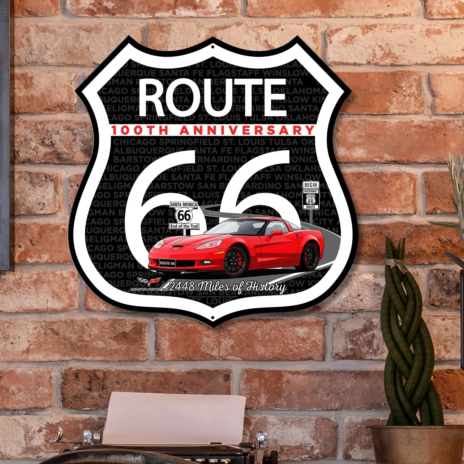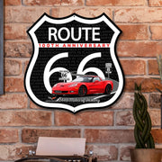 Celebrate a century of America’s most iconic highway with this C6 Corvette Route 66 100th Anniversary Die-Cut Shield, featuring a bold design and classic red convertible. Shaped like the legendary Route 66 road sign, this commemorative piece highlights the full 2,448-mile journey from Chicago to Santa Monica. With vivid city names, “2448 Miles of History” text, and a striking red-on-white anniversary banner, this USA-made artwork is perfect for collectors, car enthusiasts, and fans of vintage Americana. Its durable construction and unique silhouette make it ideal for wall display or gifting. Available in 2 Sizes.