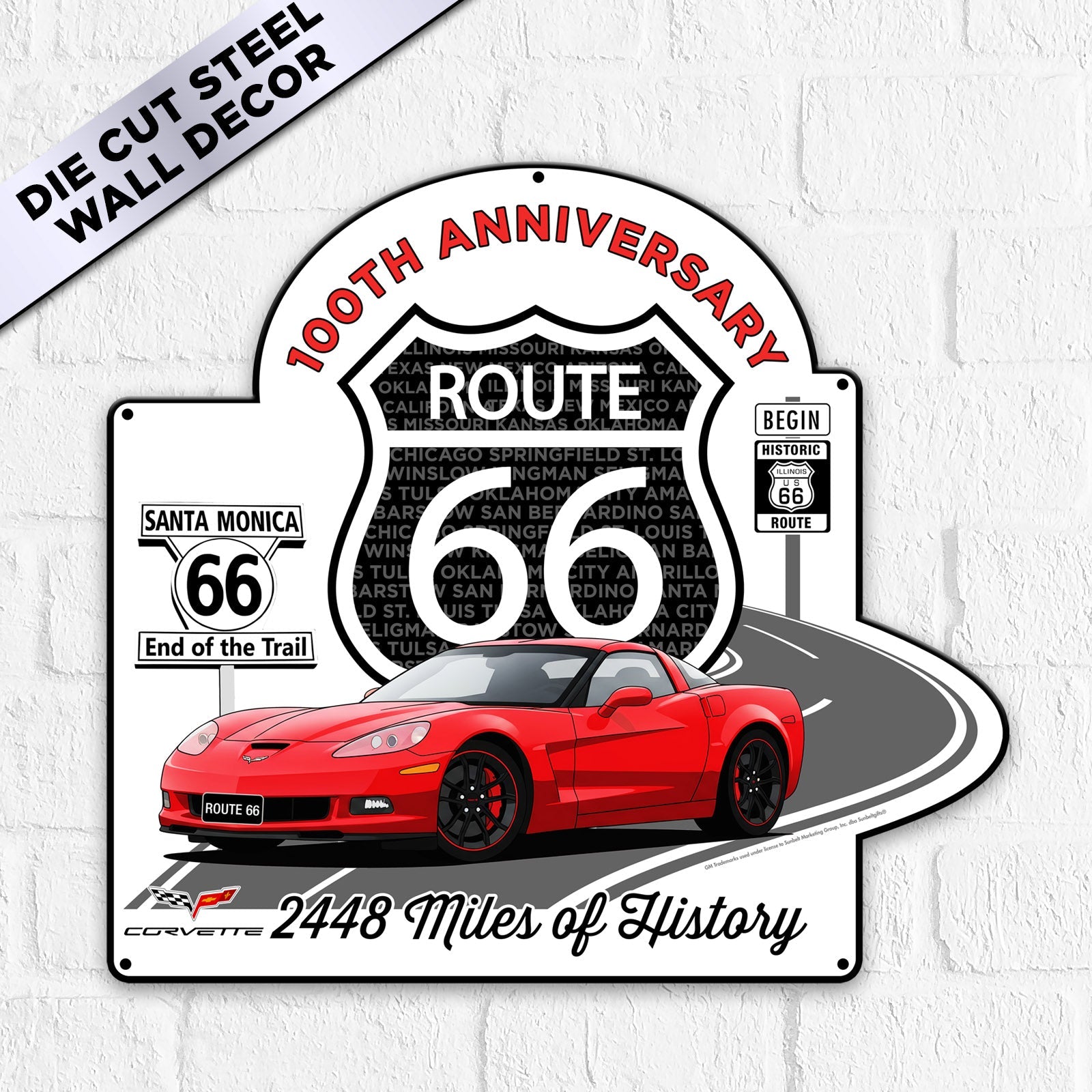Celebrate the 100th Anniversary of Route 66 with this USA-made Metal Sign featuring the officially licensed Red C6 Corvette Edition from General Motors. Crafted from durable 22-gauge metal and die-cut for a distinctive silhouette, this sign captures the spirit of the legendary 2,448-mile highway from Chicago to the Santa Monica Pier. Showcasing the iconic Route 66 badge alongside a classic red C6 Corvette, it offers rivet holes for easy wall mounting and blends vintage appeal with lasting quality—making it a perfect tribute for collectors and enthusiasts of American muscle cars and cultural heritage.