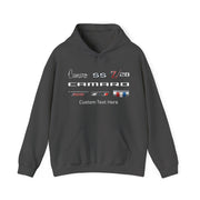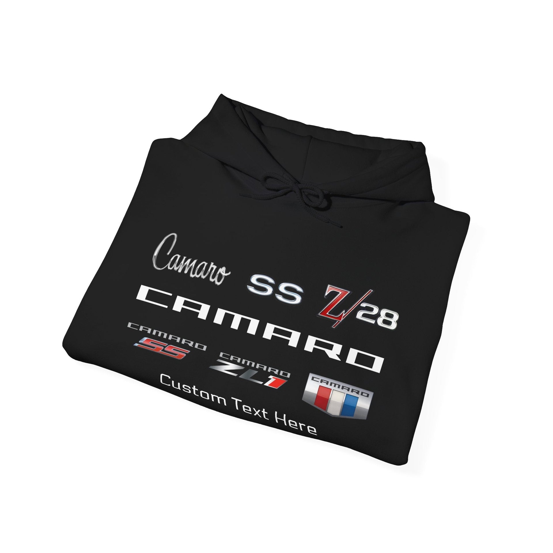 Show off your love for the iconic Camaro with our custom-designed hoodie. Featuring the classic Camaro logos on the front, this hoodie combines timeless style with a personal touch. The sleek design allows you to add your own custom text below the logo, making it uniquely yours. Available in six colors