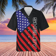 Carroll Shelby American Flag Hawaiian Shirt, Carbon Background with Shelby in Bold Print