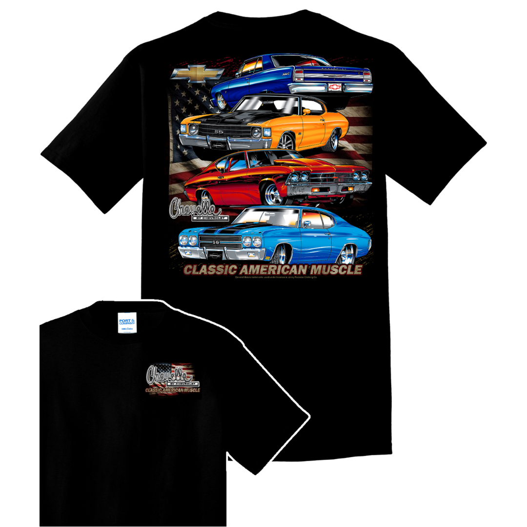 Few names carry the weight of true American muscle like the Chevelle. This Chevelle Americana graphic tee brings together multiple generations of Chevrolet Chevelles layered over a distressed Old Glory backdrop, honoring the horsepower, style, and street presence that made the Chevelle a legend.