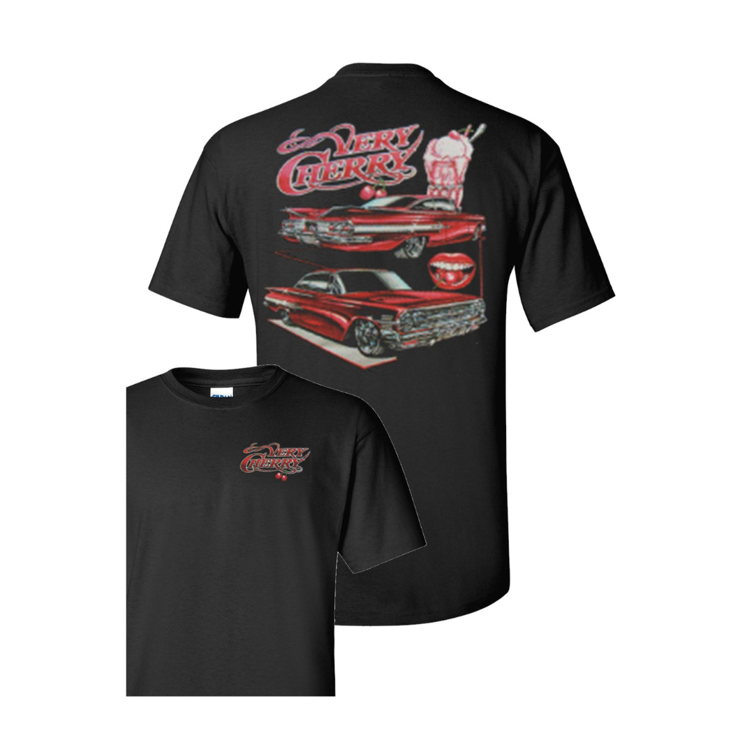• Full red, white and silver graphic of a classic 1960 Chevrolet Impala and cherry sundae on back.