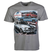 Shelby All American GT-350 Mustang printed on the front of a 100% cotton gray t-shirt. Officially licensed by Shelby.
