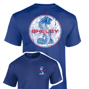 Celebrate your love of Shelby with this premium blue Shelby Cobra Weathered T-shirt. Crafted from 100% soft cotton, this shirt features a weathered Shelby Cobra Super Snake logo encircled on the back. Licensed by Carroll Shelby, it's a perfect blend of style and heritage. Easy to care for and machine washable, this shirt offers comfort and durability, making it an essential piece for any Shelby enthusiast’s collection.