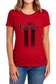 Add a pop of automotive pride to your wardrobe with the Chevrolet Camaro Stripes Women's Short Sleeve T-shirt in Red—where style meets passion!