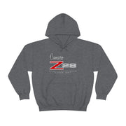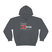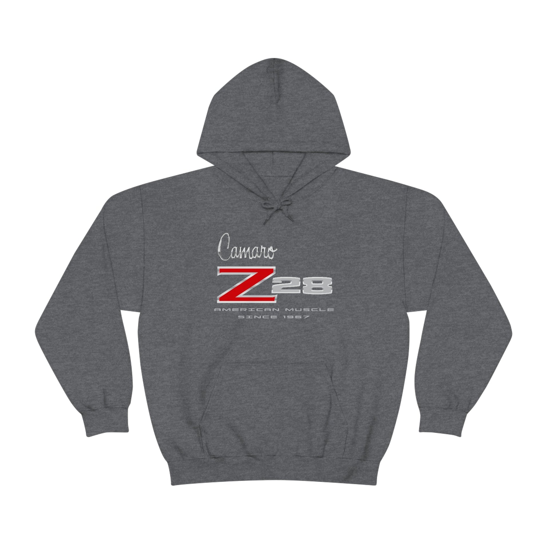 This Camaro 1st Gen Z28 heavy blend hooded sweatshirt is relaxation itself. Made with a thick blend of cotton and polyester, it feels plush, soft and warm, a perfect choice for any cold day. In the front, the spacious kangaroo pocket adds daily practicality while the hood's drawstring is the same color as the base sweater for extra style points.