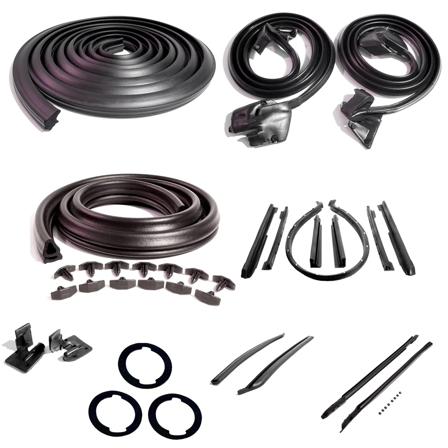 The SUPERsoft RK 8100-111 Master Kit is a comprehensive solution tailored for 1970 and 1971 Pontiac GTO 2-Door Convertibles, offering unrivaled precision and design. Often hailed as the "Restore Essential Kit" or "Luxury Ride Pack," this all-in-one set ensures a superior restoration experience. Comprised of high-quality components like the door seal (LM 12-G) and trunk seal (TK 46-16), the kit promises a snug fit and exceptional sealing performance. With sleek black finishes, these seals offer both a stylish look and functional protection against weather and noise.This kit stands out with its precisely engineered grooves that facilitate ease of alignment during installation, saving time and hassle. Each seal is crafted to mitigate air leaks and vibrations, enhancing comfort for your driving experience. The soft material ensures easy installation by simply matching each piece to its corresponding location on the vehicle, offering a straightforward yet secure fit.Ensuring your GTO remains stylish, functional, and durable, the SUPERsoft RK 8100-111 is the perfect choice for those who value quality and comfort. Equip your ride with the assurance of our platinum warranty, a 30-year commitment guaranteeing free replacement—a no-hassle promise that underscores our confidence and your peace of mind. Revitalize your classic vehicle and enhance its longevity by choosing quality today.