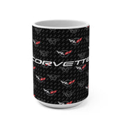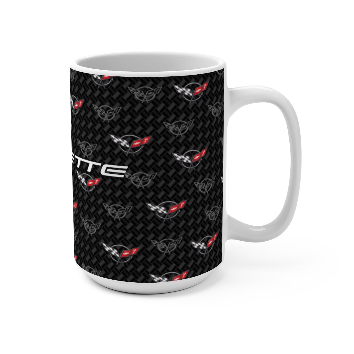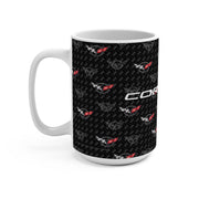 Corvette C5 15oz Ceramic Mug – Corvette Script & C5 Logos on Carbon Background, Perfect Corvette Fan Gift