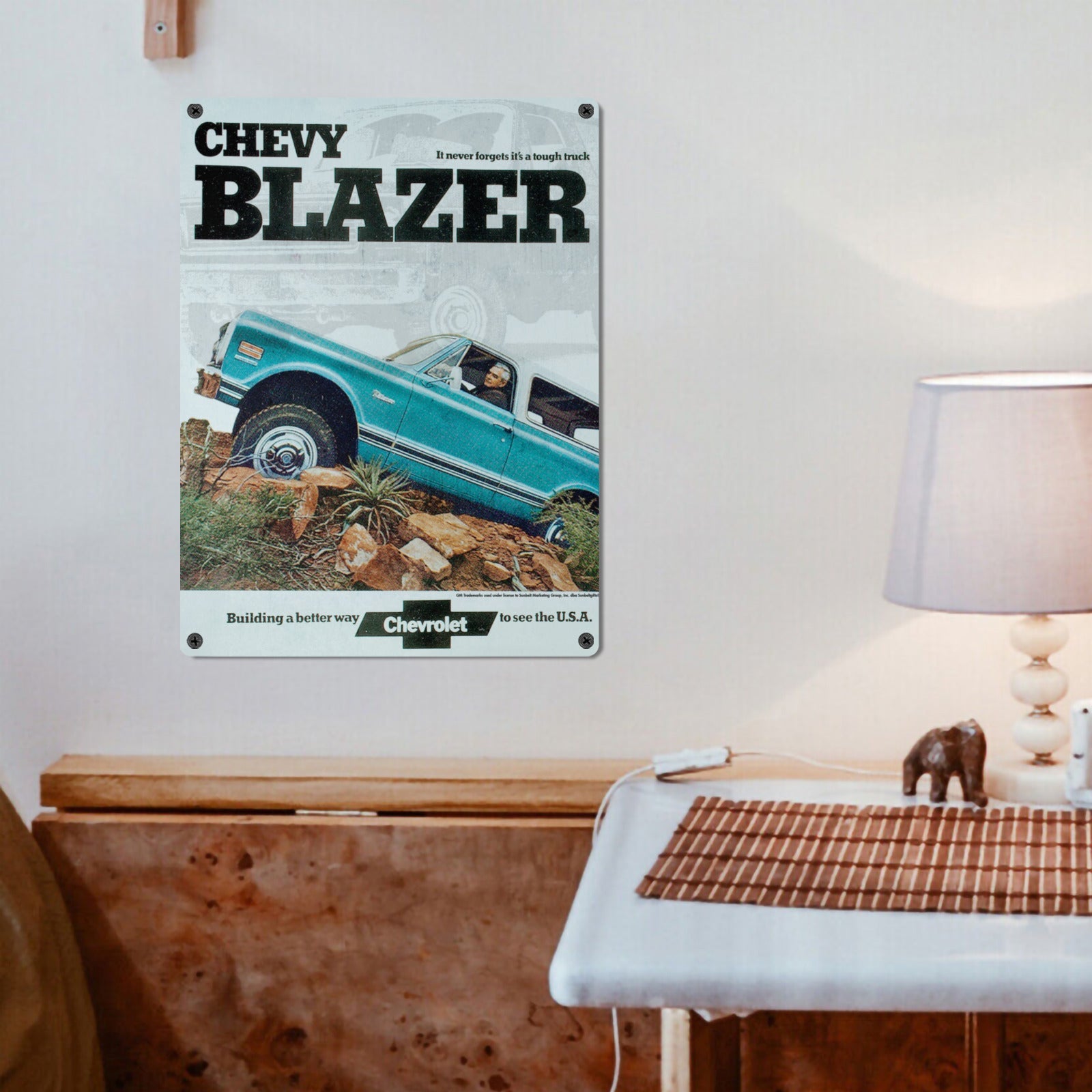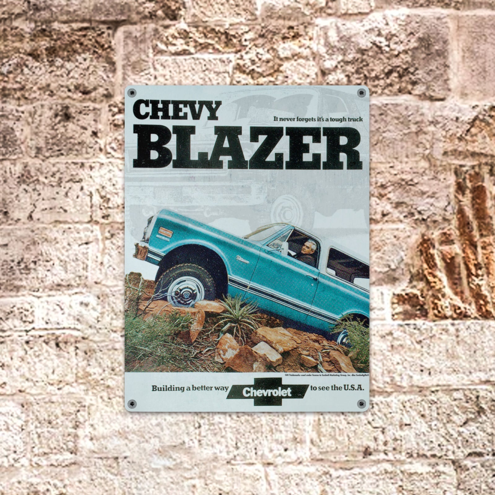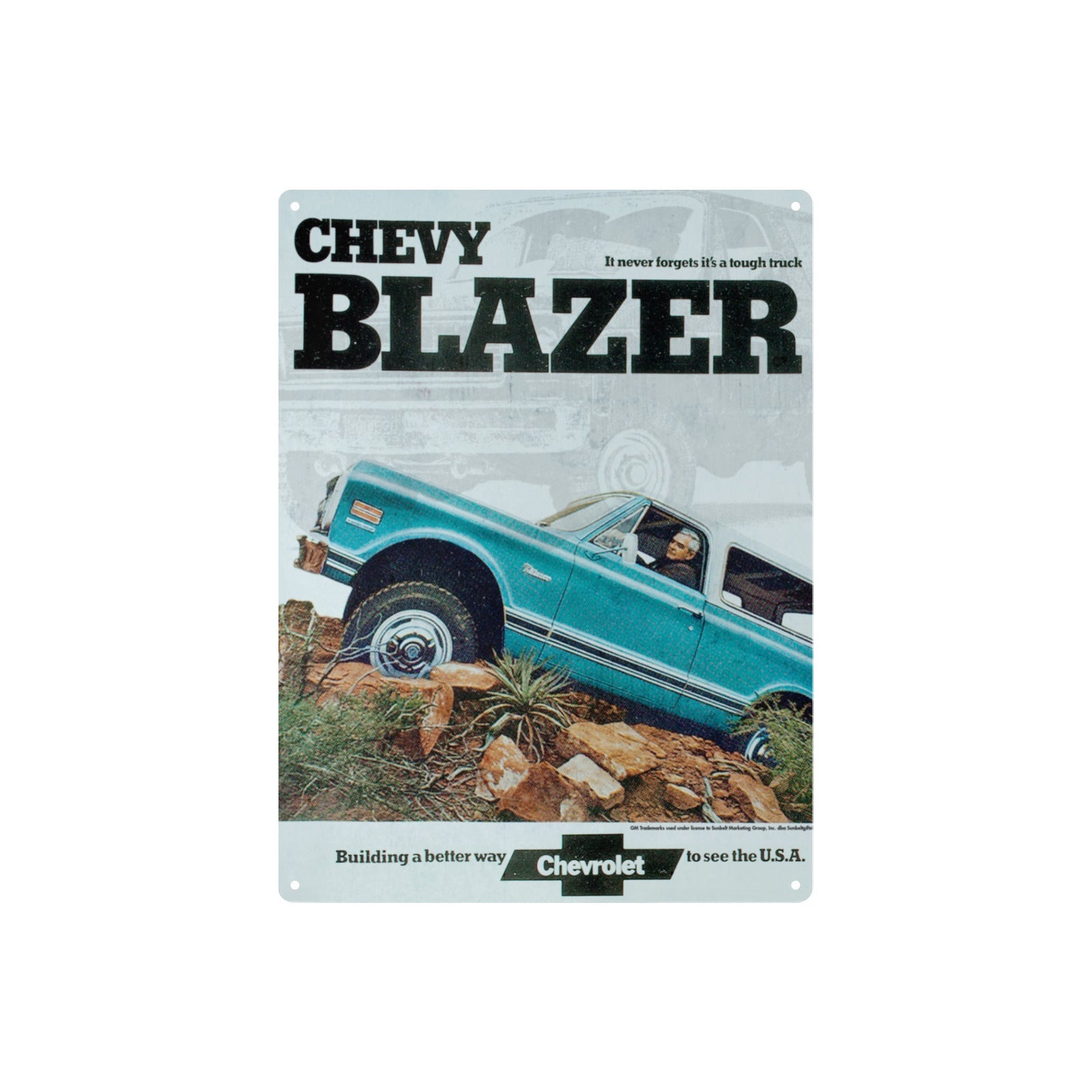 Add a touch of mid-century automotive charm to your home or garage with this eye-catching Chevy Blazer Tin Sign. Made from 100% tin metal, this 12"x16" wall sign features vivid, one-sided printing that captures the bold lines and spirit of the legendary Chevy Blazer in brilliant detail. The sign includes “It never forgets it's a tough truck” tagline, making it a standout piece of retro decor. Whether you're furnishing a man cave, diner, bar, or office, this piece brings vintage vibes with modern durability. It’s easy to hang, simple to maintain, and proudly printed in the USA for fast domestic shipping.