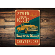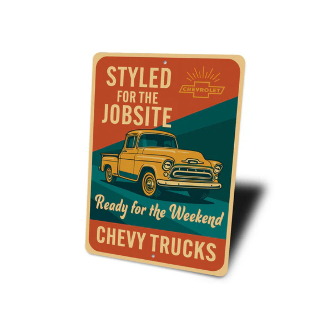 This Chevy Truck Styled For Jobsite Ready For The Weekend Sign makes a great gift!