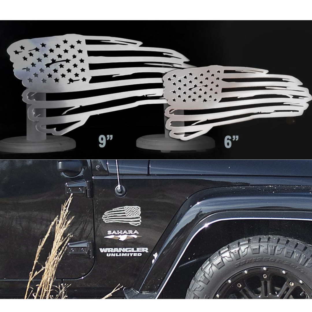 Equip any Jeep or truck (Chevy, Dodge, Ford, GMC, etc.) with our new 6"x3.5" American Flag Emblems. Our Battle Worn American Flag Emblems are laser-cut from premium stainless steel and have a permanent 3M adhesive backing for easy peel & stick installation. It's a unique way to give an American accent to any vehicle. Choose a finish and select 1-piece for the driver's side, or the 2-piece set for driver & passenger side.