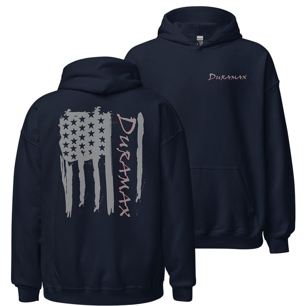 Show your patriotic diesel pride with this Duramax hoodie! Featuring a striking American flag on the back, this hoodie is perfect for any Duramax enthusiast. Keep cozy and display your love of trucks at the same time!
