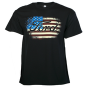 Ford script knocked out of the American Flag, printed on a 100% cotton black t-shirt. Officially licensed by Ford Motor Company.