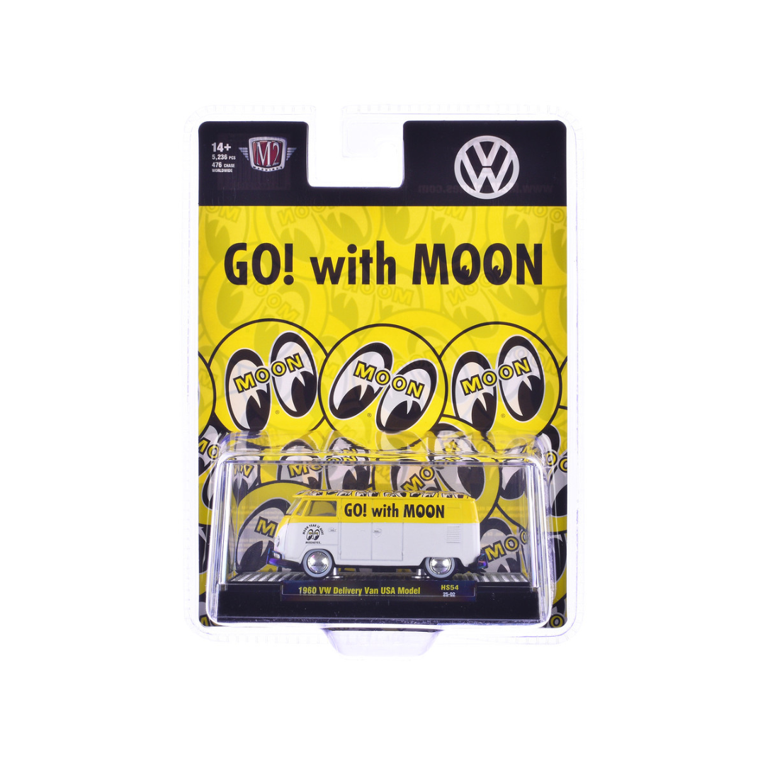 Brand new 1/64 scale diecast car model of 1960 Volkswagen Delivery Van USA Model "MoonEyes" White and Yellow with Top Graphics and White Interior Limited Edition to 5236 pieces Worldwide diecast model car by M2 Machines.