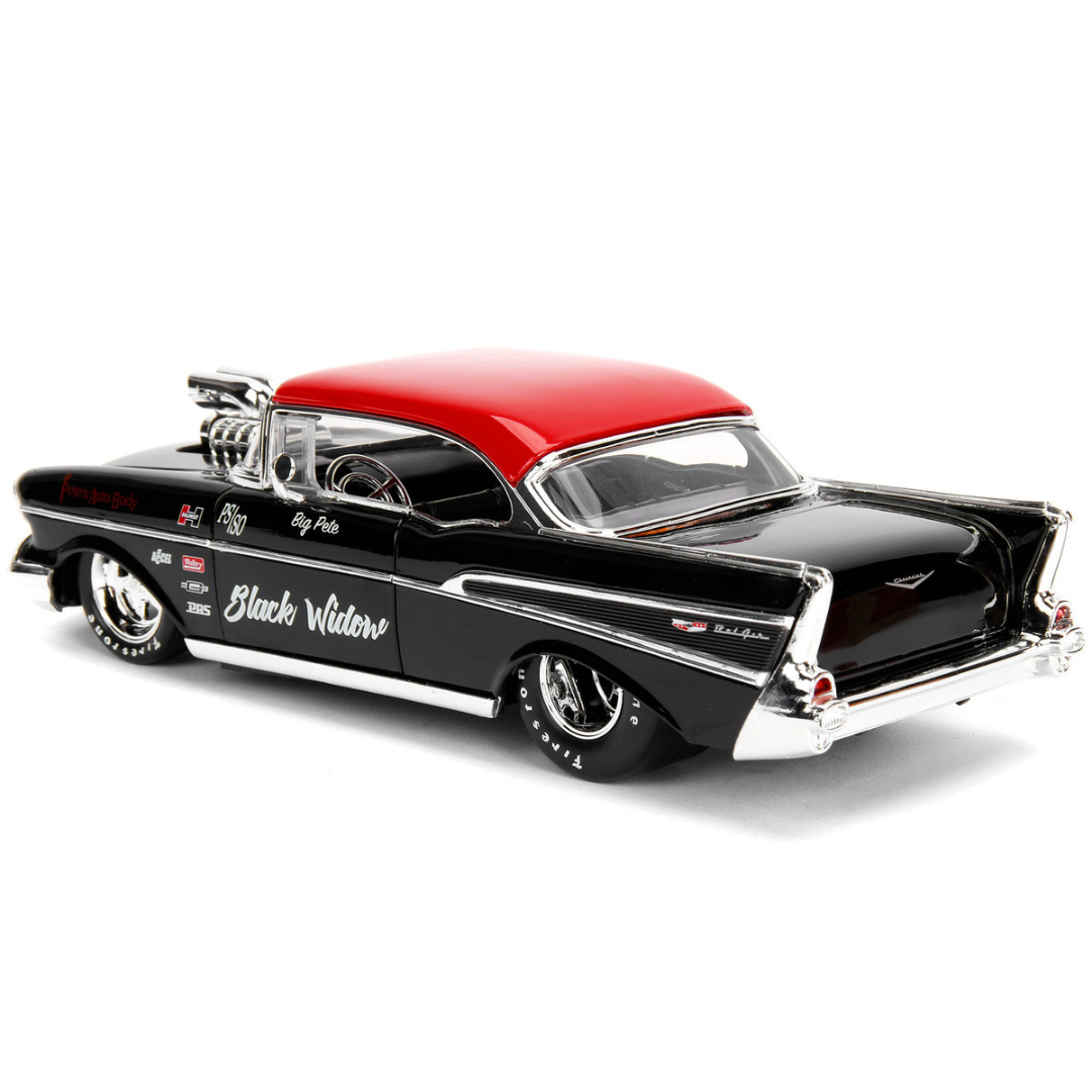 Brand new 1/24 scale diecast car model of 1957 Chevrolet Bel Air Black with Red Top "Pete's Auto Body: Black Widow" "Bigtime Muscle" Series die cast model car by Jada.