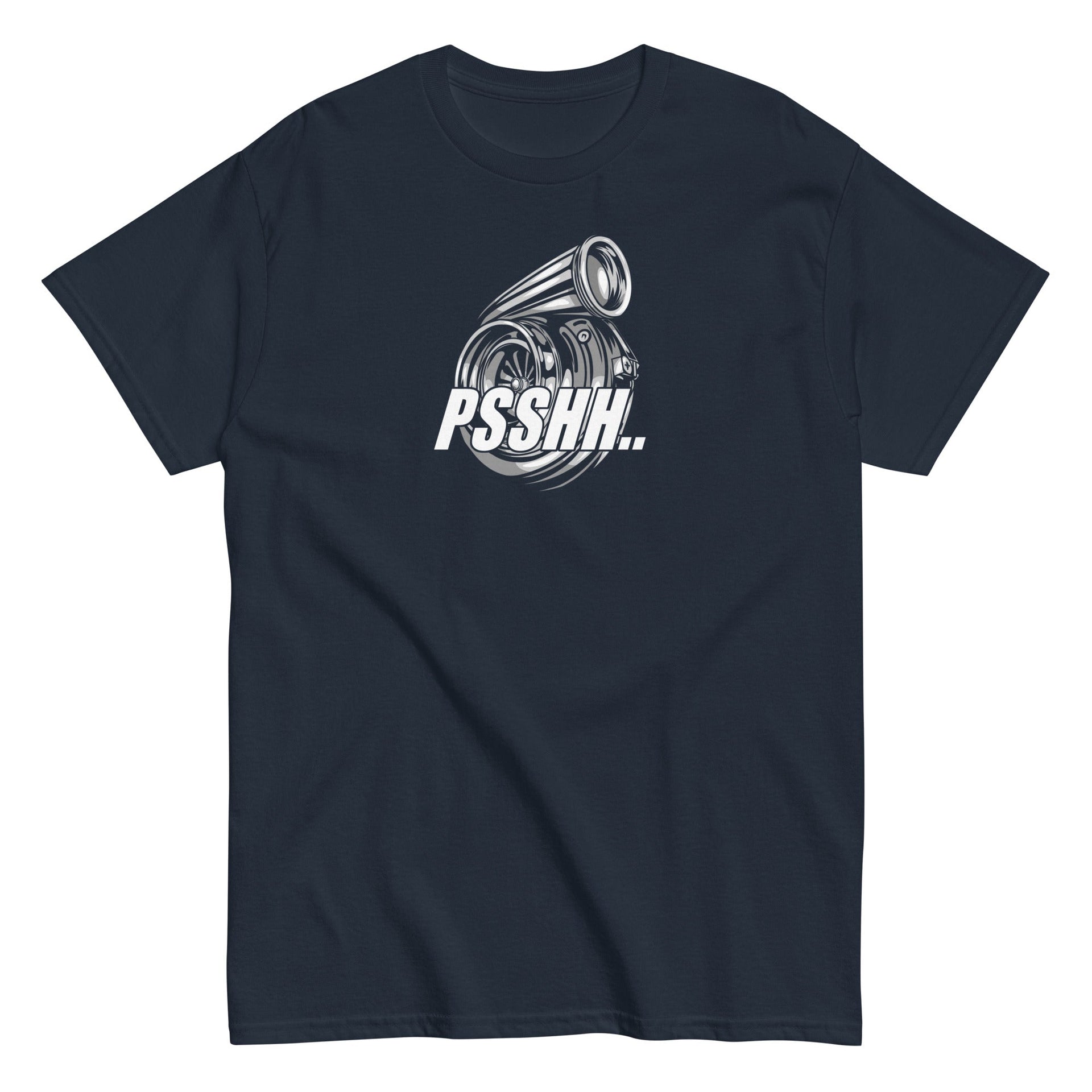 Show off your turbocharged humor with this Funny Car Guy Turbo Enthusiast T-Shirt, a perfect blend of style and wit for anyone passionate about cars. The design centers around an eye-catching image of a turbo, complemented by the playful 'PSSHH' – capturing the distinctive sound of a turbocharger in action. It's an instant conversation starter for anyone into turbo diesel, JDM, or racing culture.